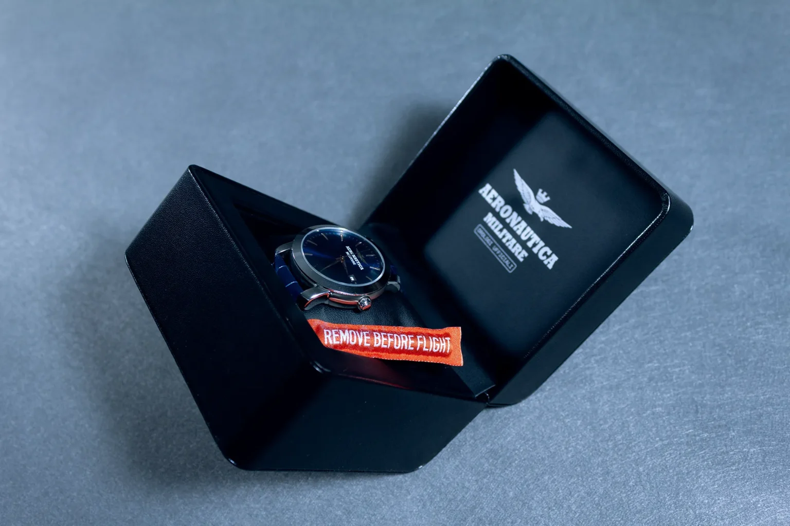 The watches come with a ‘remove before flight’ label reminiscent of those found on aircraft and bearing the Italian Air Force’s official product marking.